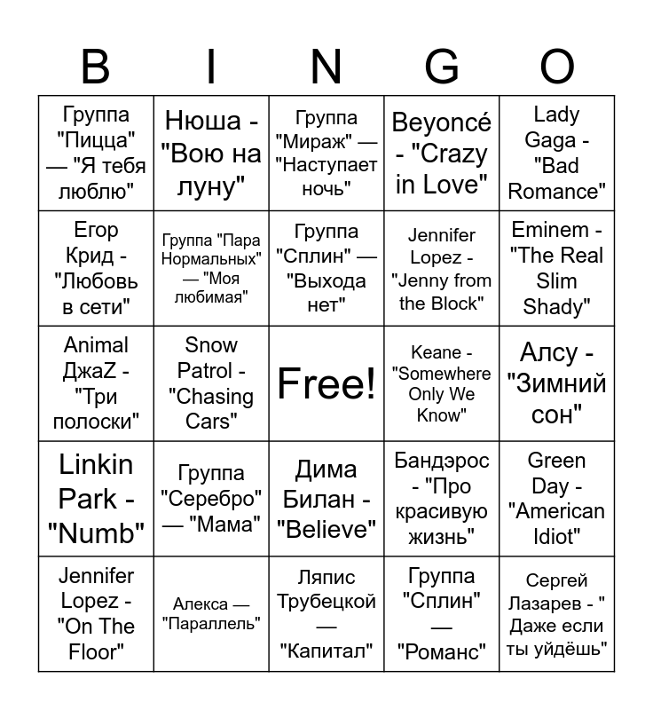 This bingo card has a free space and 30 words: Алекса — "Параллель", Sean Paul - "Get Busy", Snow Patrol - "Chasing Cars", Kelly Clarkson - "Since U Been Gone", Группа "Пицца" — "Я тебя люблю", Группа "Мираж" — "Наступает ночь", Группа "Пара Нормальных" — "Моя любимая", Дима Билан - "Believe", Keane - "Somewhere Only We Know", Ляпис Трубецкой — "Капитал", Алсу - "Зимний сон", Сергей Лазарев - " Даже если ты уйдёшь", Группа "Сплин" — "Романс", Группа "Кипелов" — "Я свободен", Eminem - "The Real Slim Shady", Гости из будущего - "Ты где-то", Бандэрос - "Про красивую жизнь", Linkin Park - "Numb", Группа "Серебро" — "Мама", Lady Gaga - "Bad Romance", Animal ДжаZ - "Три полоски", James Blunt - "You're Beautiful", Нюша - "Вою на луну", Jennifer Lopez - "Jenny from the Block", Егор Крид - "Любовь в сети", Beyoncé - "Crazy in Love", Green Day - "American Idiot", Jennifer Lopez - "On The Floor", Группа "Сплин" — "Выхода нет" and Тату - "All About Us".