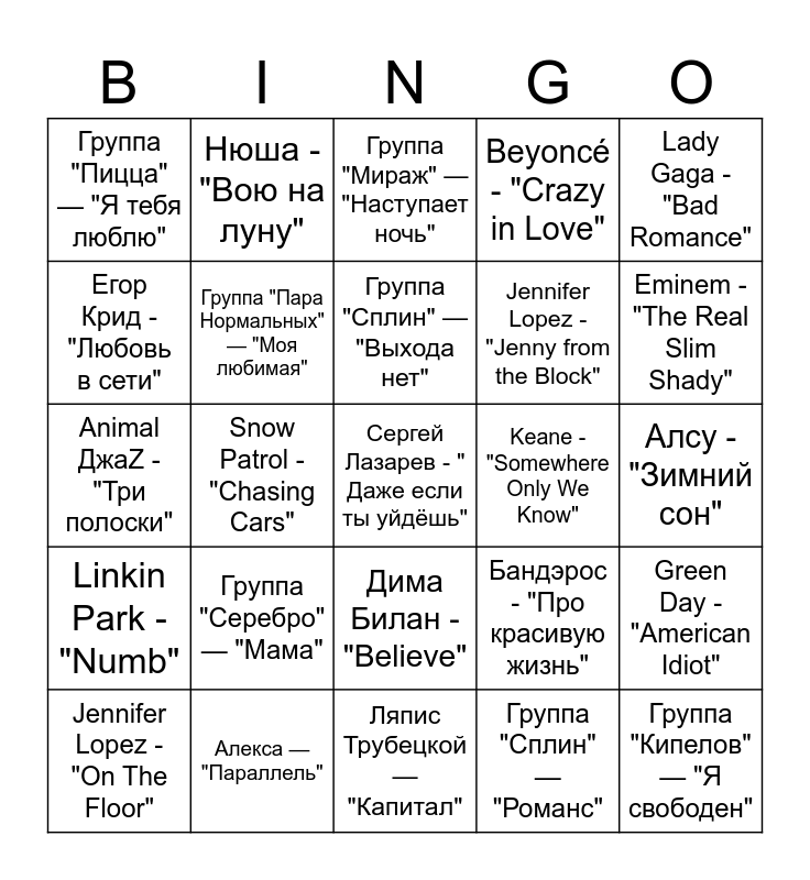 This bingo card has 30 words: Алекса — "Параллель", Sean Paul - "Get Busy", Snow Patrol - "Chasing Cars", Kelly Clarkson - "Since U Been Gone", Группа "Пицца" — "Я тебя люблю", Группа "Мираж" — "Наступает ночь", Группа "Пара Нормальных" — "Моя любимая", Дима Билан - "Believe", Keane - "Somewhere Only We Know", Ляпис Трубецкой — "Капитал", Алсу - "Зимний сон", Сергей Лазарев - " Даже если ты уйдёшь", Группа "Сплин" — "Романс", Группа "Кипелов" — "Я свободен", Eminem - "The Real Slim Shady", Гости из будущего - "Ты где-то", Бандэрос - "Про красивую жизнь", Linkin Park - "Numb", Группа "Серебро" — "Мама", Lady Gaga - "Bad Romance", Animal ДжаZ - "Три полоски", James Blunt - "You're Beautiful", Нюша - "Вою на луну", Jennifer Lopez - "Jenny from the Block", Егор Крид - "Любовь в сети", Beyoncé - "Crazy in Love", Green Day - "American Idiot", Jennifer Lopez - "On The Floor", Группа "Сплин" — "Выхода нет" and Тату - "All About Us".