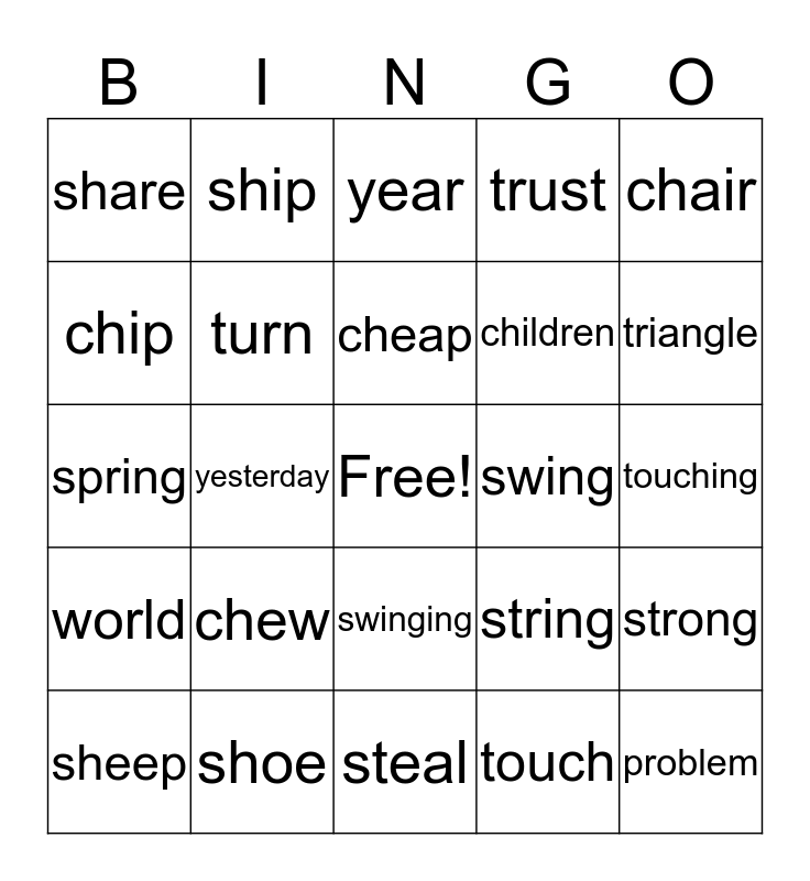 This bingo card has a free space and 24 words: chew, shoe, cheap, sheep, chair, share, chip, ship, swing, swinging, children, spring, string, strong, turn, touch, touching, year, triangle, yesterday, problem, world, trust and steal.