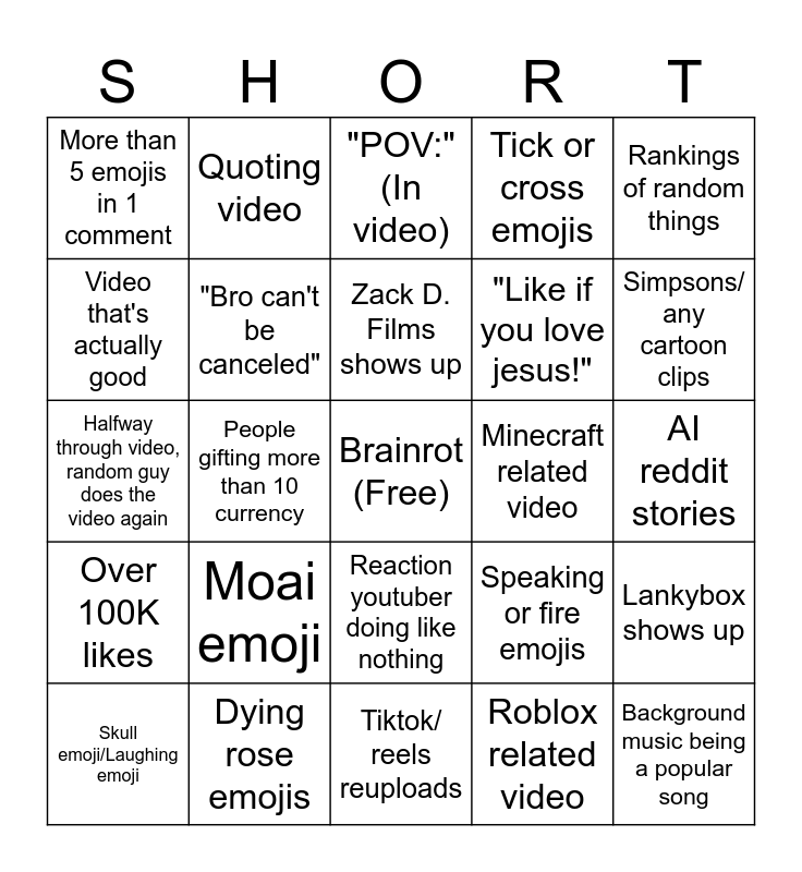This bingo card has a free space and 29 words: Skull emoji/Laughing emoji, "Bro", People gifting more than 10 currency, Tram emoji/any spammable emoji, More than 5 emojis in 1 comment, "POV:" (In video), "Bro can't be canceled", Moai emoji, Minecraft related video, Dying rose emojis, AI reddit stories, Background music being a popular song, Tiktok/ reels reuploads, Roblox related video, Simpsons/ any cartoon clips, "POV:" (In comments), Reaction youtuber doing like nothing, Over 100K likes, Rankings of random things, Halfway through video, random guy does the video again, Speaking or fire emojis, Any "gen alpha" slang, "Like if you love jesus!", Video that's actually good, Tick or cross emojis, Quoting video, Lankybox shows up, Zack D. Films shows up and H1T1 shows up.