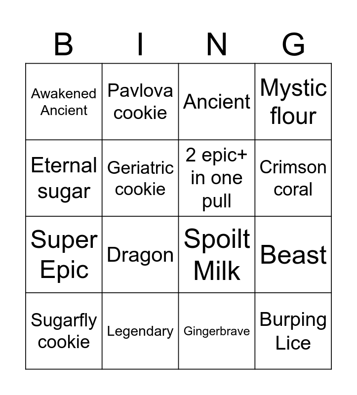 This bingo card has 16 words: Legendary, Beast, Ancient, Awakened Ancient, Super Epic, Pavlova cookie, Spoilt Milk, Gingerbrave, Eternal sugar, Geriatric cookie, Sugarfly cookie, Mystic flour, Dragon, Crimson coral, 2 epic+ in one pull and Burping Lice.