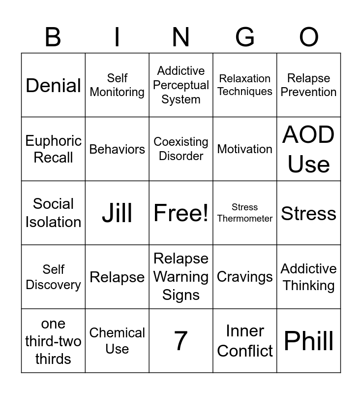 This bingo card has a free space and 24 words: Relapse, Chemical Use, Coexisting Disorder, one third-two thirds, Relapse Prevention, Denial, Euphoric Recall, Self Monitoring, Stress Thermometer, Relapse Warning Signs, Motivation, Social Isolation, Cravings, Addictive Thinking, Behaviors, Inner Conflict, Stress, Addictive Perceptual System, AOD Use, Jill, Phill, Self Discovery, Relaxation Techniques and 7.