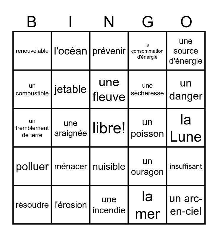This bingo card has a free space and 70 words: une pluie acide, un archipel, un ours, un récif de corail, un danger, la déforestation, jetable, potable, une sécheresse, sèche/sec, un tremblement de terre, en voie d'extinction, la consommation d'énergie, une source d'énergie, l'environnement, l'érosion, une incendie, un poisson, une inondation, un combustible, le réchauffement climatique, nuisible, un ouragon, insuffisant, une terre, un paysage, un lion, un singe, la Lune, une chaîne montagneuse, l'océan, en plein air, la couche d'ozone, un cochon, la pollution, protégé, pur, une forêt tropicale, un arc-en-ciel, renouvelable, une ressource, une fleuve, la mer, un mouton, un nuage de pollution, une araignée, le soleil, une superficie, un tigre, être contaminé, respirer, empirer, nuire à, chasser, polluer, préserver, prévenir, protéger, supporter, résoudre, ménacer, jêter, tolérer, urbanizer, épuiser, gaspiller, toxique, les déchets, le gaspillage and le bien-être.