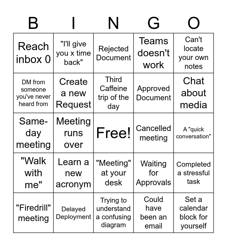 This bingo card has a free space and 24 words: Learn a new acronym, Delayed Deployment, Third Caffeine trip of the day, "Firedrill" meeting, Can't locate your own notes, Reach inbox 0, DM from someone you've never heard from, "I'll give you x time back", Cancelled meeting, "Meeting" at your desk, Approved Document, Same-day meeting, Waiting for Approvals, Completed a stressful task, Create a new Request, Could have been an email, A "quick conversation", Rejected Document, Chat about media, Meeting runs over, Set a calendar block for yourself, "Walk with me", Teams doesn't work and Trying to understand a confusing diagram.