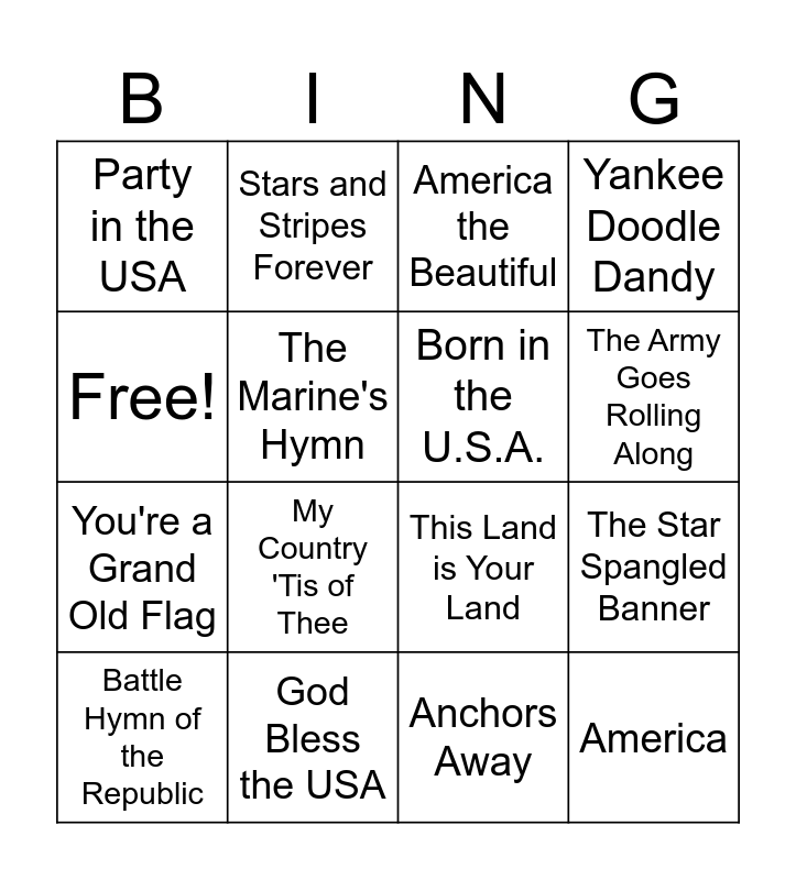 This bingo card has 16 words: God Bless the USA, The Star Spangled Banner, America the Beautiful, Party in the USA, You're a Grand Old Flag, Stars and Stripes Forever, This Land is Your Land, Anchors Away, Free!, The Marine's Hymn, Battle Hymn of the Republic, Yankee Doodle Dandy, My Country 'Tis of Thee, The Army Goes Rolling Along, Born in the U.S.A. and America.