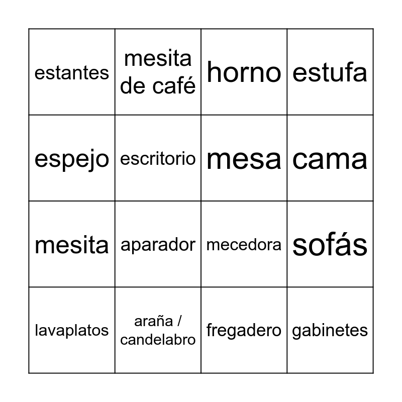 This bingo card has 26 words: almohadas, mesita de noche, cama, gavetero / tocador, espejo, estantes, escritorio, mesita de café, fregadero, butaca, mesita, mecedora, sillón, alfombra, sofás, refrigerador y congelador, estufa, gabinetes, horno, lavaplatos, aparador, chinero, araña / candelabro, alfombra china, mesa and sillas.