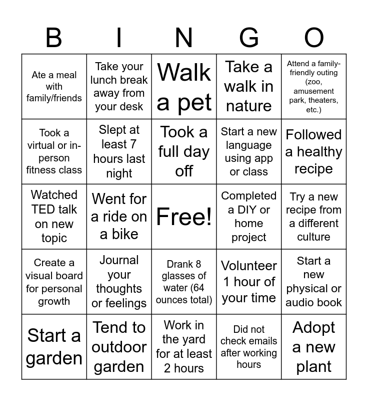 This bingo card has a free space and 55 words: Contribute steps to walking groups, Went for a ride on a bike, Got out with family or friends, Take a walk in nature, Went outside for fresh air during work hours, Ate 3+ servings of fruit/vegetables in a single day, Slept at least 7 hours last night, Took a class or webinar unrelated to work, Completed a DIY or home project, Did 20+ minute workout (any type), Took a virtual or in-person fitness class, Did yoga or Pilates, Drank 8 glasses of water (64 ounces total), Practiced mediation or deep breathing for at least 10 mins, Did a digital detox for at least an hour, Meal prep for the week, Take your lunch break away from your desk, Walk a pet, Declutter your digital or physical space, Try a new recipe from a different culture, Start a garden, Tend to outdoor garden, Work in the yard for at least 2 hours, Start a new language using app or class, Listen to an educational podcast episode, Watched TED talk on new topic, Journal your thoughts or feelings, Read a book outside or in a quiet setting, Volunteer 1 hour of your time, Adopt a new plant, Join a book club, Try out new cooking or baking recipes, Take a weekend trip, Join a recreational sport team, Attend a family-friendly outing (zoo, amusement park, theaters, etc.), Create a visual board for personal growth, Go caffeine-free for a day (24 hours), Took a full day off, Started a new TV series, Took a nap, Ate a meal with family/friends, Worked on a hobby for 30+ mins, Stretch at your desk or after a meeting, Cooked at home instead of ordering out, Start a new physical or audio book, Attend a team-building event, Took a 5-minute meditation break, Went for a walk during my lunch break, Attended a wellness workshop, Followed a healthy recipe, Logged off from work on time, Took a mental health day, Practiced gratitude journaling, Did not check emails after working hours and Created a Mindful Transition routine from work to personal time.