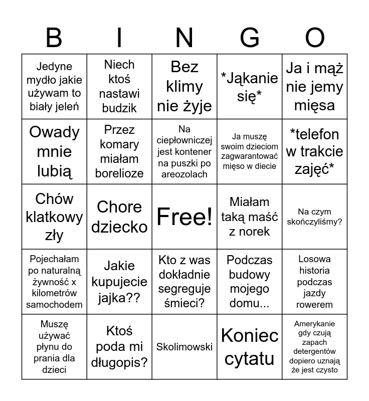This bingo card has a free space and 24 words: Jakie kupujecie jajka??, Ktoś poda mi długopis?, Na ciepłowniczej jest kontener na puszki po areozolach, Muszę używać płynu do prania dla dzieci, Ja i mąż nie jemy mięsa, Jedyne mydło jakie używam to biały jeleń, Owady mnie lubią, Niech ktoś nastawi budzik, Miałam taką maść z norek, Kto z was dokładnie segreguje śmieci?, Ja muszę swoim dzieciom zagwarantować mięso w diecie, Chów klatkowy zły, Podczas budowy mojego domu..., Losowa historia podczas jazdy rowerem, Przez komary miałam borelioze, Koniec cytatu, Na czym skończyliśmy?, Bez klimy nie żyje, *telefon w trakcie zajęć*, Chore dziecko, Amerykanie gdy czują zapach detergentów dopiero uznają że jest czysto, Pojechałam po naturalną żywność x kilometrów samochodem, *Jąkanie się* and Skolimowski.