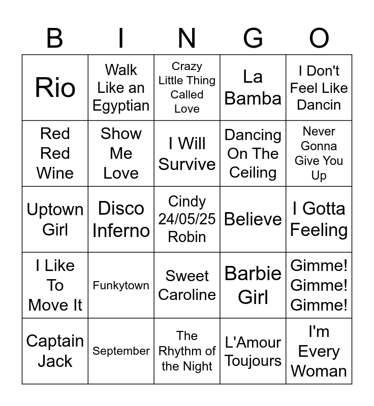 This bingo card has a free space and 75 words: ...Baby One More Time, Whenever, Wherever, Crazy Little Thing Called Love, You're The One That I Want, I'll Be There for You, Macarena, YMCA, Stop! In The Name Of Love, The Final Countdown, Africa, Karma Chameleon, Thunderstruck, I Will Survive, Red Red Wine, Come On Eileen, Disco Inferno, I'm Like A Bird, I'm Every Woman, Human, I Don't Feel Like Dancin, Rock DJ, Uptown Girl, Show Me Love, Walk Like an Egyptian, La Bamba, Fame, Jailhouse Rock, Let's Get Loud, Mambo No. 5, Eye of the Tiger, Que Si, Que No, Lambada, Despacito, Barbie Girl, Never Gonna Give You Up, Dancing On The Ceiling, Sweet Dreams, I'm Still Standing, I Gotta Feeling, L'Amour Toujours, Hit the Road Jack, Summer Of '69, Footloose, Sterrenstof, You Can't Hurry Love, Tainted Love, Captain Jack, Rio, Coco Jamboo, Copacabana, Conga!, Sweet Caroline, Rock Your Body, Suavemente, I'm Too Sexy, Rasputin, Destination Calabria, I Was Made For Lovin' You, Hey DJ, Tequila, Funkytown, Fireball, Infinity, Rainbow in the Sky, Freed From Desire, Believe, Rhythm Is a Dancer, Heart Skips a Beat, Take on Me, Gimme! Gimme! Gimme!, I Like To Move It, September, Stayin Alive, The Rhythm of the Night and Blue.