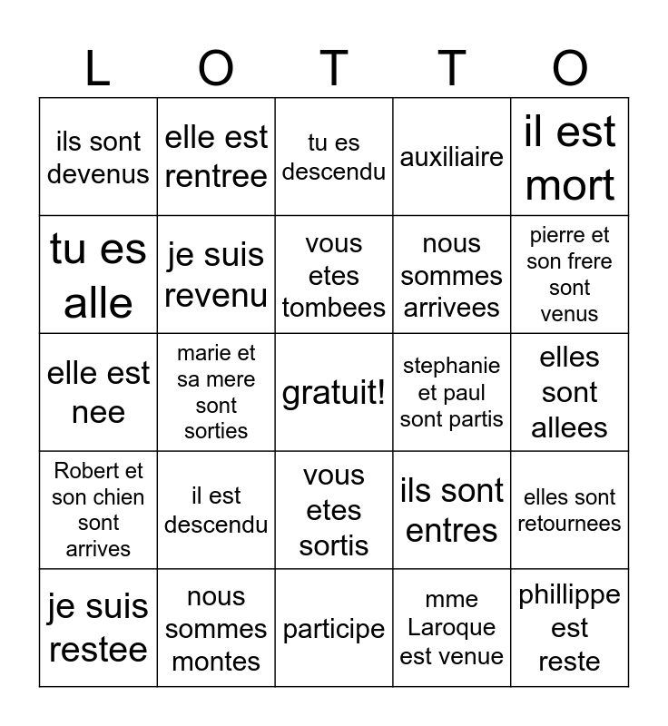 This bingo card has a free space and 24 words: il est descendu, nous sommes montes, vous etes tombees, je suis restee, il est mort, ils sont devenus, tu es alle, elle est rentree, stephanie et paul sont partis, vous etes sortis, nous sommes arrivees, elle est nee, ils sont entres, elles sont retournees, je suis revenu, mme Laroque est venue, elles sont allees, tu es descendu, pierre et son frere sont venus, marie et sa mere sont sorties, phillippe est reste, Robert et son chien sont arrives, auxiliaire and participe.