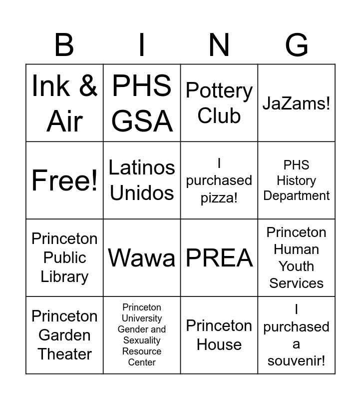 This bingo card has 16 words: Princeton University Gender and Sexuality Resource Center, Princeton Human Youth Services, Pottery Club, Ink & Air, Princeton Public Library, PHS GSA, PREA, Princeton House, Free!, Latinos Unidos, Princeton Garden Theater, JaZams!, Wawa, PHS History Department, I purchased pizza! and I purchased a souvenir!.