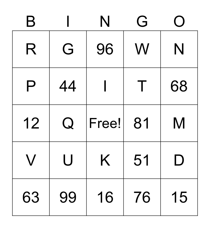 This bingo card has a free space and 66 words: A, B, C, D, E, F, G, H, I, J, K, L, M, N, O, P, Q, R, S, T, U, V, W, X, Y, Z, 7, 92, 15, 38, 63, 4, 87, 26, 51, 99, 33, 12, 76, 58, 44, 2, 81, 19, 90, 35, 68, 9, 24, 100, 73, 48, 29, 14, 61, 5, 22, 80, 96, 16, 41, 55, 31, 70, 60 and 11.