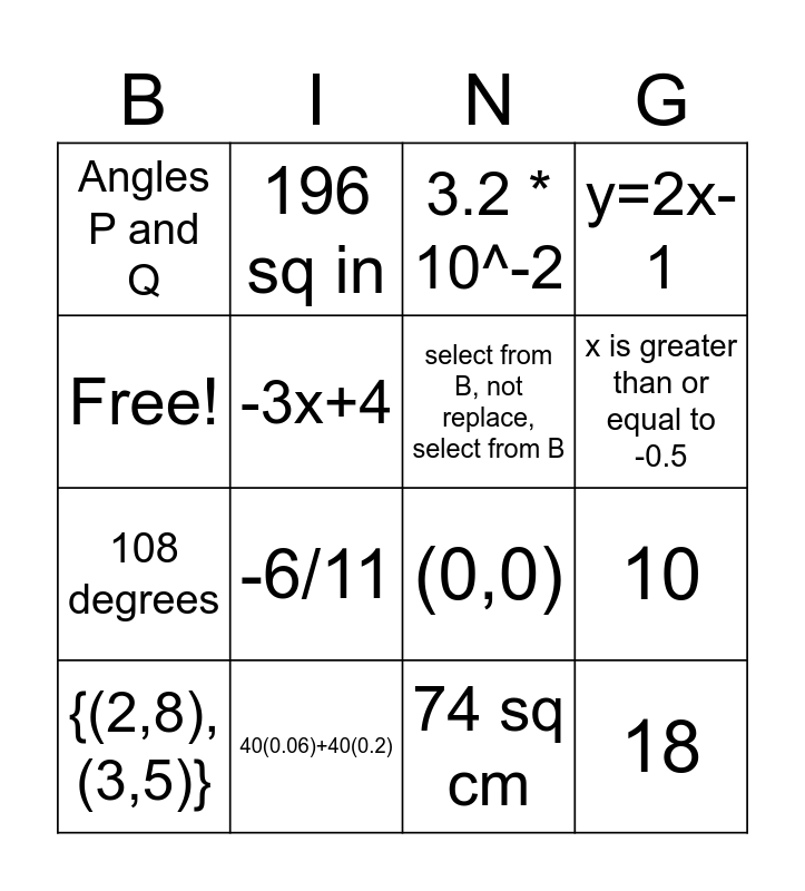 This bingo card has 16 words: 40(0.06)+40(0.2), 10, 3.2 * 10^-2, Angles P and Q, 108 degrees, 196 sq in, (0,0), 74 sq cm, Free!, -3x+4, {(2,8),(3,5)}, y=2x-1, -6/11, x is greater than or equal to -0.5, select from B, not replace, select from B and 18.