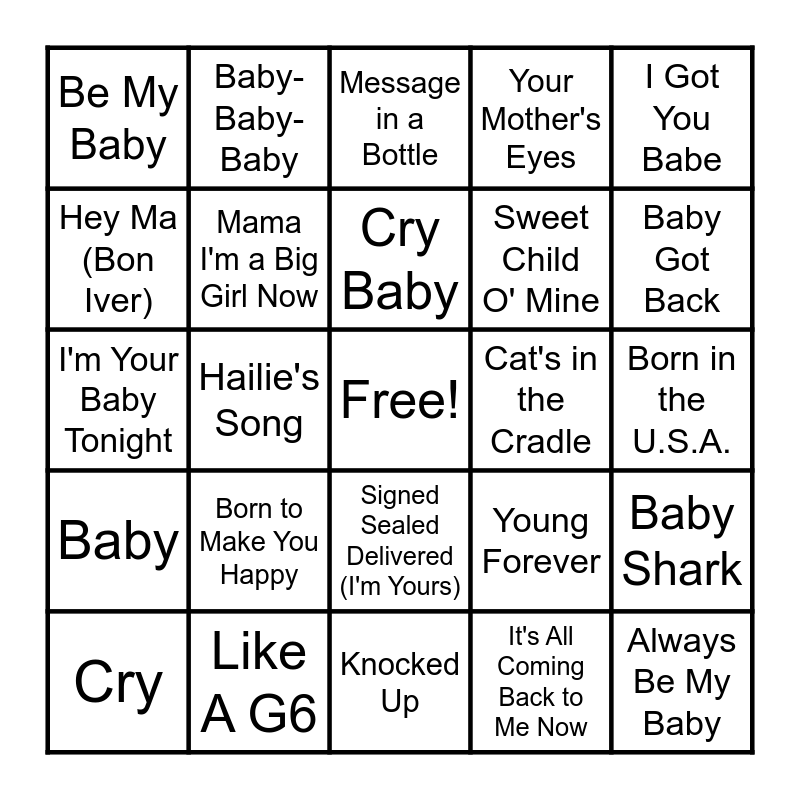 This bingo card has a free space and 60 words: ...Baby One More Time, Like A G6, Ice Ice Baby, Baby, It's All Coming Back to Me Now, Stacy's Mom, Mama I'm a Big Girl Now, Bohemian Rhapsody, Sweet Child O' Mine, Genie in a Bottle, Your Mother's Eyes, Hey Ma (Cam'ron), Hey Ma (Bon Iver), Hey Mama, The Mother, Be My Baby, Always Be My Baby, I Got You Babe, Big Girls Don't Cry, Cry Baby, Cat's in the Cradle, Message in a Bottle, Cry, Baby Shark, Baby It's You, Mammas Don't Let Your Babies Grow Up to Be Cowboys, All-American Girl, American Girl, Baby Got Back, Pretty Fly (For a White Guy), Don't Worry Baby, Circle of Life, I'll Make a Man Out of You, Baby (Brandy), Baby-Baby-Baby, Rock Wit U (Awww Baby), Baby (Ashanti), Hailie's Song, Sexy Daddy, I'm Your Baby Tonight, Rock Your Body, Born to Make You Happy, Born in the U.S.A., Crawl, Young Forever, Born This Way, When I Grow Up, Birthday Cake, I'm Just a Kid, Signed Sealed Delivered (I'm Yours), Knocked Up, Be My Baby Tonight, Daddy's Money, Who's Your Daddy?, Daughters, Daughter, Tell Me Baby, You Are Your Mother's Child, Rockabye and Mamma Mia.