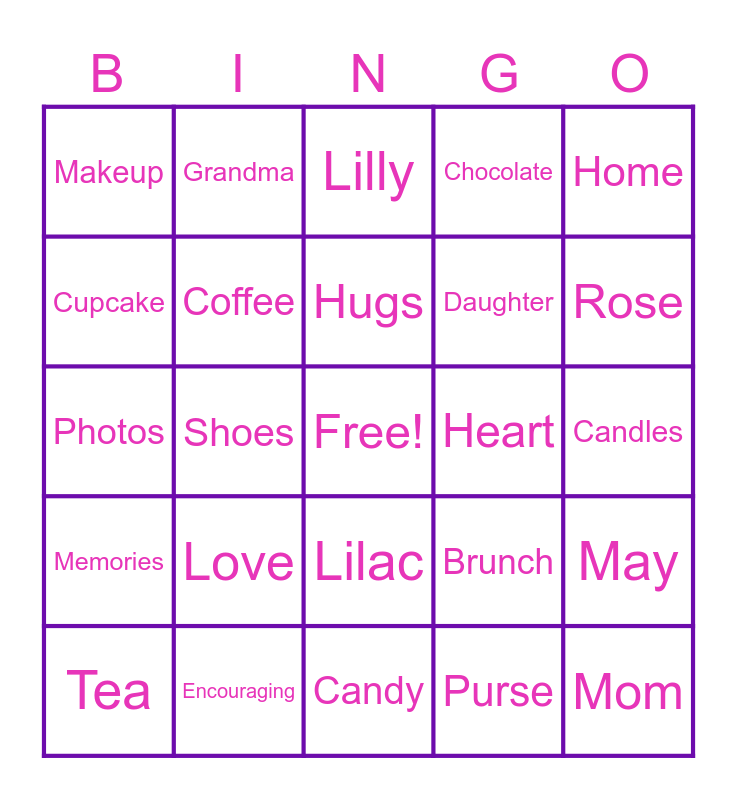 This bingo card has a free space and 50 words: Mother, Mom, Flowers, Candy, Love, Beautiful, Grandma, Aunt, Cupcake, Card, Coffee, Chocolate, May, Brunch, Perfume, Jewelry, Hugs, Heart, Balloons, Home, Shoes, Purse, Makeup, Daughter, Son, Daisy, Rose, Tulip, Lilly, Lilac, Ice Cream, Cookies, Kind, Leader, Encouraging, Patient, Supportive, Dependable, Wine, Candles, Books, Laughter, Spa, Kisses, Tea, Photos, Garden, Shopping, Memories and Smart.