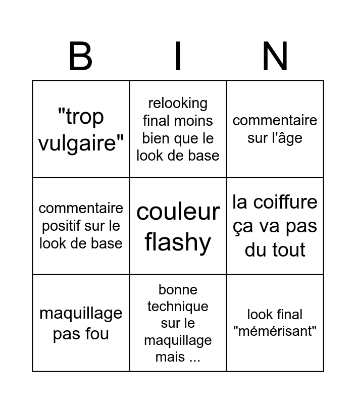 This bingo card has a free space and 8 words: la coiffure ça va pas du tout, commentaire sur l'âge, relooking final moins bien que le look de base, maquillage pas fou, "trop vulgaire", look final "mémérisant", commentaire positif sur le look de base and bonne technique sur le maquillage mais ....