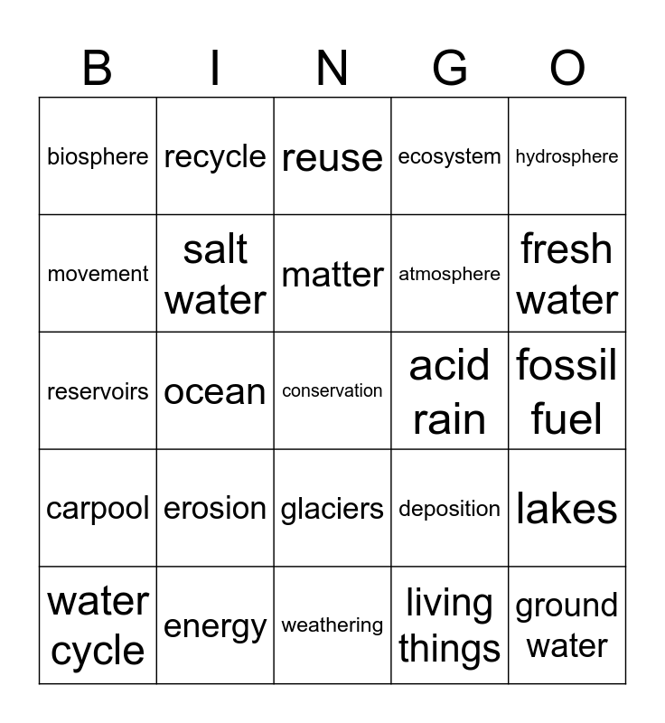 This bingo card has 25 words: erosion, weathering, matter, water cycle, hydrosphere, biosphere, movement, recycle, acid rain, glaciers, atmosphere, reservoirs, deposition, lakes, salt water, ground water, fossil fuel, reuse, fresh water, ocean, conservation, energy, carpool, ecosystem and living things.
