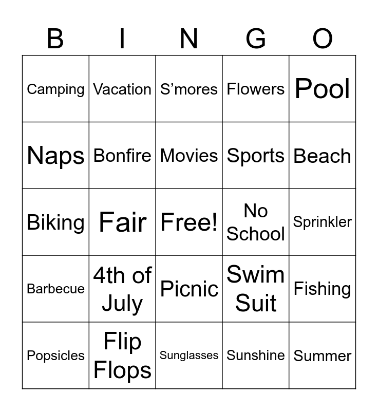 This bingo card has a free space and 25 words: Barbecue, Flip Flops, Sunglasses, Sunshine, Pool, Camping, Vacation, S’mores, No School, Fishing, Naps, Bonfire, Ice Cream, Swim Suit, Beach, Popsicles, Fair, Movies, Sports, Sprinkler, Biking, 4th of July, Picnic, Flowers and Summer.