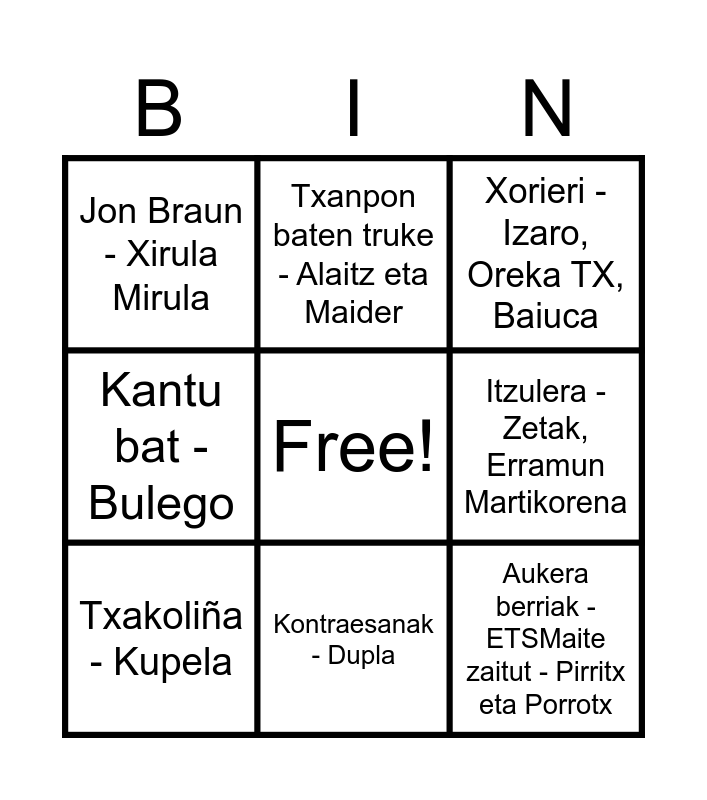 This bingo card has a free space and 24 words: Akelarretan - Zetak, Pedro Mayo - Joxe Ripiau, Kontraesanak - Dupla, Oihu - Bengo, Aukera berriak - ETSMaite zaitut - Pirritx eta Porrotx, Jon Braun - Xirula Mirula, Itzulera - Zetak, Erramun Martikorena, Txanpon baten truke - Alaitz eta Maider, Ikusi Mendizaleak - Leihotikan, Begitara Begira - Vendetta, Ilargia - Ken Zazpi, Euritan dantzan - Gatibu, Lau Teilatu - Itoiz, Txoria txori - Mikel Laboa, Txakoliña - Kupela, Erre zenituzten - Xabi Solano, Errefuxiatuena - Izaro, Xorieri - Izaro, Oreka TX, Baiuca, Negua joan da ta - Zea Mays, Paradisu Zinema - Joxe Ripiau, Iñundik Iñoare - Huntza, Sagarra jo! - Kolokan, Kantu bat - Bulego and Arratsalde honetan - Sorotan Bele.