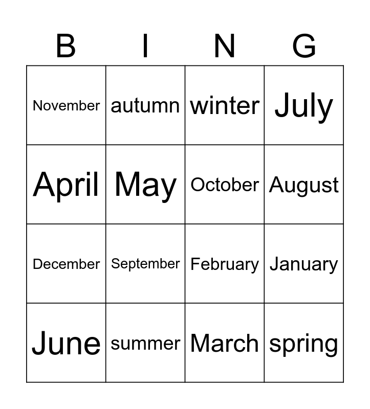 This bingo card has 16 words: summer, January, winter, November, December, autumn, February, March, April, May, June, July, September, August, October and spring.