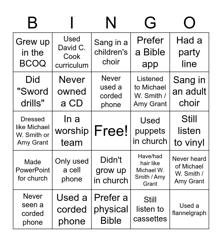 This bingo card has a free space and 24 words: Only used a cell phone, Used a corded phone, Never used a corded phone, Never seen a corded phone, Had a party line, Grew up in the BCOQ, Did "Sword drills", Used David C. Cook curriculum, Used puppets in church, Didn't grow up in church, Listened to Michael W. Smith / Amy Grant, Dressed like Michael W. Smith or Amy Grant, Have/had hair like Michael W. Smith / Amy Grant, Never heard of Michael W. Smith / Amy Grant, Never owned a CD, Still listen to cassettes, Still listen to vinyl, Sang in a children's choir, Sang in an adult choir, In a worship team, Used a flannelgraph, Made PowerPoint for church, Prefer a Bible app and Prefer a physical Bible.