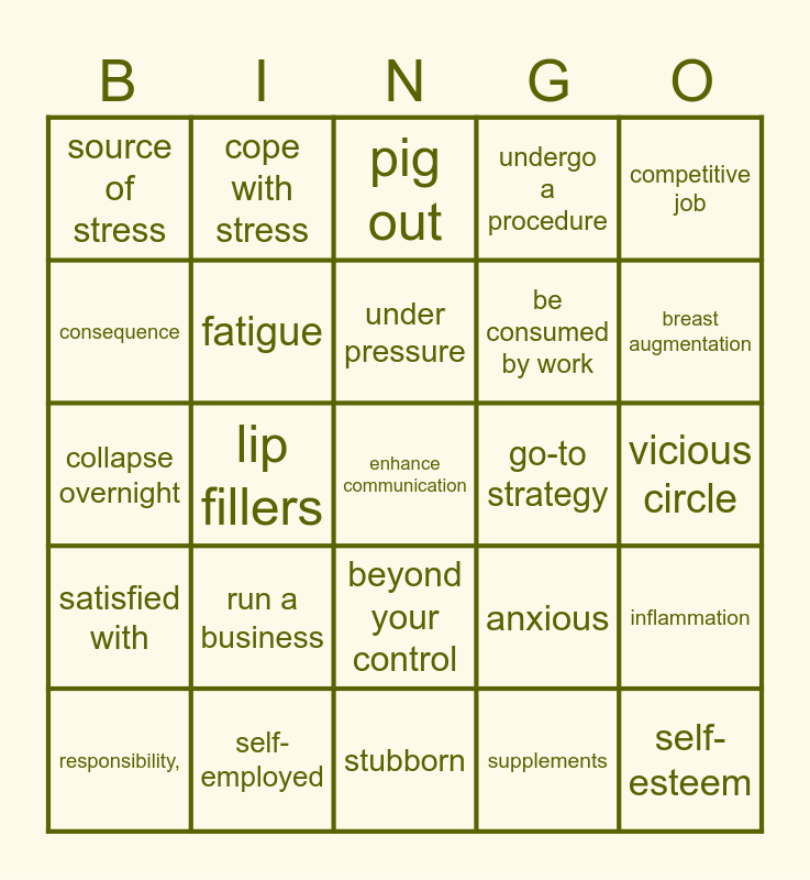 This bingo card has a free space and 24 words: run a business, self-employed, under pressure, responsibility,, competitive job, source of stress, consequence, cope with stress, go-to strategy, beyond your control, be consumed by work, collapse overnight, anxious, inflammation, fatigue, supplements, vicious circle, pig out, breast augmentation, lip fillers, self-esteem, satisfied with, undergo a procedure and stubborn.