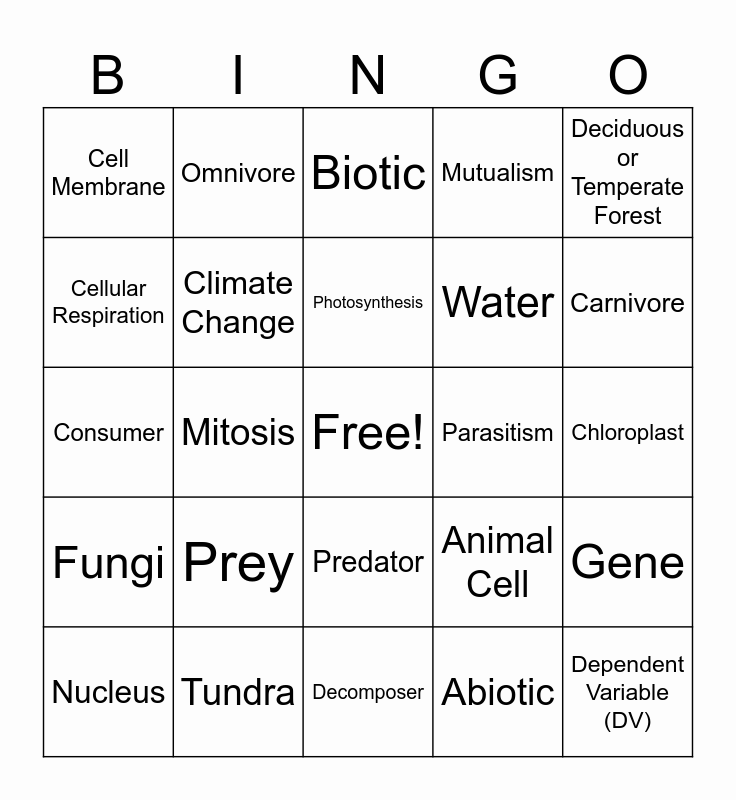 This bingo card has a free space and 44 words: Independent Variable (IV), Dependent Variable (DV), Mitochondria, Nucleus, Punnett Square, Abiotic, Biotic, Rainforest, Deciduous or Temperate Forest, Tundra, Mutualism, Parasitism, Predator, Prey, Evolution, Decomposer, Producer, Consumer, Herbivore, Carnivore, Omnivore, Sun, Domain, Cell Membrane, Cell Wall, Chloroplast, Vacuole, Plant Cell, Animal Cell, Fungi, Kingdom, Gene, DNA, Chromosome, Mitosis, Meiosis, Phenotype, Genotype, Photosynthesis, Cellular Respiration, Water, Carbon Dioxide, Climate Change and Glucose.