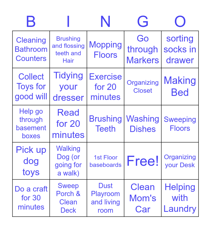 This bingo card has 25 words: Walking Dog (or going for a walk), Dust Playroom and living room, Exercise for 20 minutes, Do a craft for 30 minutes, sorting socks in drawer, Cleaning Bathroom Counters, Collect Toys for good will, Brushing and flossing teeth and Hair, Washing Dishes, 1st Floor baseboards, Organizing Closet, Help go through basement boxes, Free!, Organizing your Desk, Tidying your dresser, Helping with Laundry, Sweeping Floors, Mopping Floors, Making Bed, Read for 20 minutes, Brushing Teeth, Sweep Porch & Clean Deck, Pick up dog toys, Go through Markers and Clean Mom's Car.