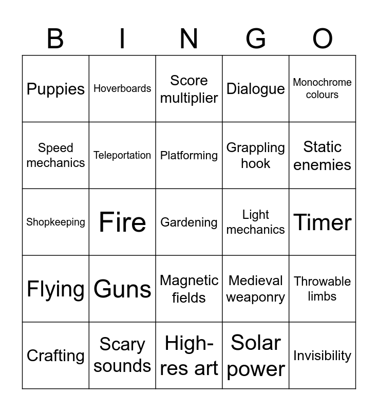 This bingo card has 25 words: Guns, High-res art, Platforming, Crafting, Monochrome colours, Puppies, Speed mechanics, Hoverboards, Light mechanics, Magnetic fields, Grappling hook, Shopkeeping, Medieval weaponry, Throwable limbs, Teleportation, Invisibility, Timer, Score multiplier, Static enemies, Fire, Gardening, Scary sounds, Flying, Dialogue and Solar power.