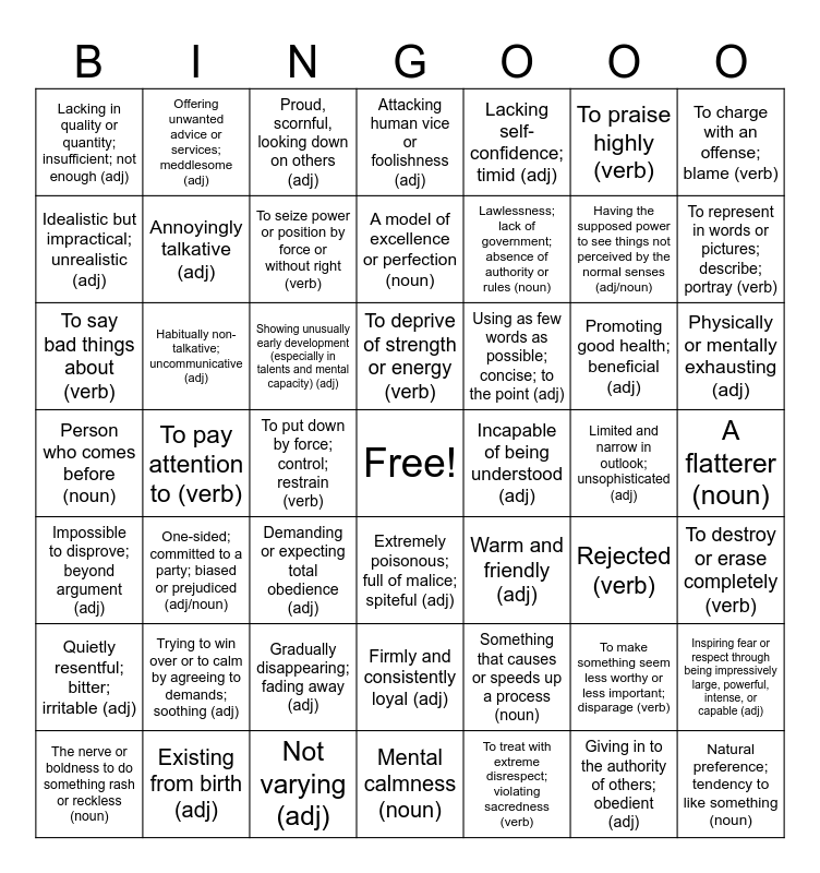 This bingo card has a free space and 100 words: Pleasing to the senses (adj), Something that causes or speeds up a process (noun), To say bad things about (verb), To flatter someone (verb), Boring (adj), Without an equal (adj), Correctness (noun), A master performer (noun), Sharp and bitter (adj), Impulsive (adj), Friendly (adj), Tricky (adj), Not varying (adj), Person who comes before (noun), To erase (verb), Rejected (verb), Annoyingly talkative (adj), Still (adj), Heavy (adj), Harshness of sound (noun), To consent without protest (verb), Using words effectively (adj), To make something seem less worthy or less important; disparage (verb), Using high-sounding language without much meaning; overblown (adj), Trying to win over or to calm by agreeing to demands; soothing (adj), To represent in words or pictures; describe; portray (verb), Lacking self-confidence; timid (adj), Using as few words as possible; concise; to the point (adj), Barely sufficient; barely adequate (adj), To bring under control; enslave (verb), Lawlessness; lack of government; absence of authority or rules (noun), Lacking in quality or quantity; insufficient; not enough (adj), Violent or unsteady disturbance or movement of air or water (noun), The nerve or boldness to do something rash or reckless (noun), To put down by force; control; restrain (verb), Idealistic but impractical; unrealistic (adj), Promoting good health; beneficial (adj), Evil; moral corruption (noun), Demanding or expecting total obedience (adj), Natural preference; tendency to like something (noun), To treat with extreme disrespect; violating sacredness (verb), Gradually disappearing; fading away (adj), A model of excellence or perfection (noun), Limited and narrow in outlook; unsophisticated (adj), To seize power or position by force or without right (verb), Proud, scornful, looking down on others (adj), Not having enough to live on; very poor, impoverished (adj), Firmly and consistently loyal (adj), Hardened in mind or feelings (adj), To pay attention to (verb), Incapable of being reformed or improved (adj), Impossible to disprove; beyond argument (adj), One-sided; committed to a party; biased or prejudiced (adj/noun), Able to float (adj), To weaken the strength or health of (verb), Inflexible, unyielding (adj), Made less perfect through injury or damage (adj/verb), Narrowly restricted in outlook (adj), A sudden outburst of anger (noun), Attacking human vice or foolishness (adj), To plead with (verb), To yield (verb), Obviously bad (adj), A warning in advance (noun), Highly valued (adj), Worshipful (adj), A drowsy state (noun), A flatterer (noun), Refined (adj), Absurdly funny (adj), Incapable of being understood (adj), Showing unusually early development (especially in talents and mental capacity) (adj), Fear, fright, trembling (noun), Something that differs from the norm (noun), Mental calmness (noun), Existing from birth (adj), Difficult to catch or to hold; hard to explain or understand (adj), To praise highly (verb), Inspiring fear or respect through being impressively large, powerful, intense, or capable (adj), Extremely poisonous; full of malice; spiteful (adj), To provide with something needed; make or have room for (verb), Having the supposed power to see things not perceived by the normal senses (adj/noun), Sharing an edge or boundary (adj), To deprive of strength or energy (verb), To destroy or erase completely (verb), Offering unwanted advice or services; meddlesome (adj), To make impossible in advance; prevent (verb), To reject or refuse with scorn (verb), Moving or acting in a cautious, deceptive way; sneaky (adj), Habitually non-talkative; uncommunicative (adj), Warm and friendly (adj), To damage the good name or reputation of (verb), Lacking agreement; lacking harmony (adj), Physically or mentally exhausting (adj), To charge with an offense; blame (verb), To teach a specific body of doctrine or point of view, excluding other options; to impose partisan or one-sided way of thinking (verb), Giving in to the authority of others; obedient (adj), Quietly resentful; bitter; irritable (adj), To oppose and defeat; obstruct, frustrate (verb) and Senseless (adj).