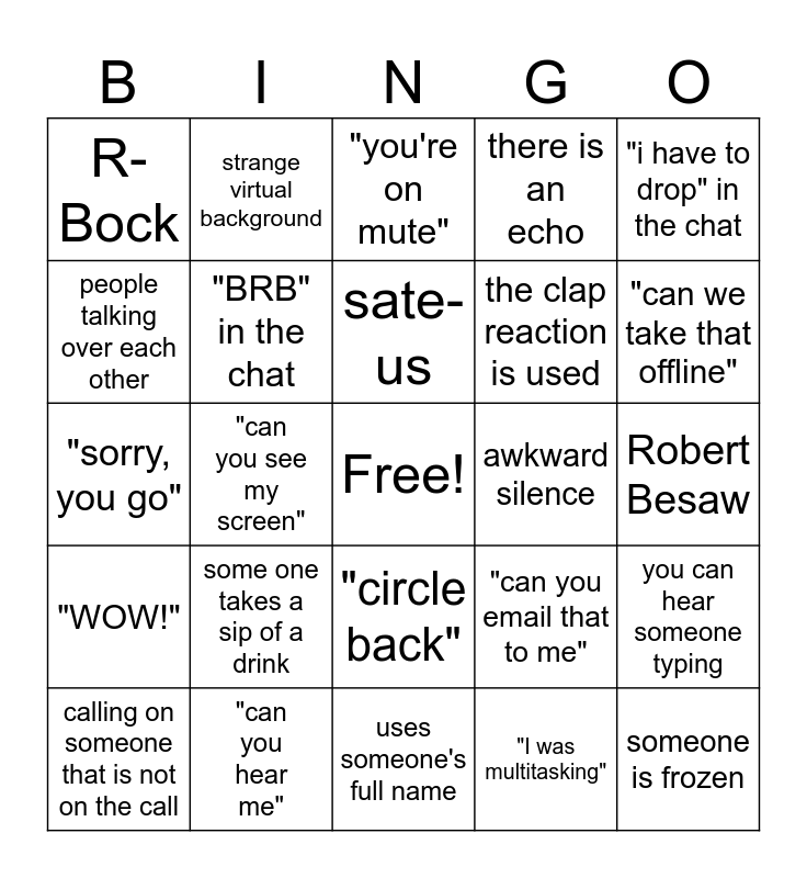 This bingo card has a free space and 24 words: some one takes a sip of a drink, "can you hear me", sate-us, calling on someone that is not on the call, "i have to drop" in the chat, R-Bock, people talking over each other, strange virtual background, awkward silence, "circle back", the clap reaction is used, "sorry, you go", "can you email that to me", you can hear someone typing, "BRB" in the chat, "I was multitasking", Robert Besaw, "you're on mute", "can we take that offline", "can you see my screen", someone is frozen, "WOW!", there is an echo and uses someone's full name.