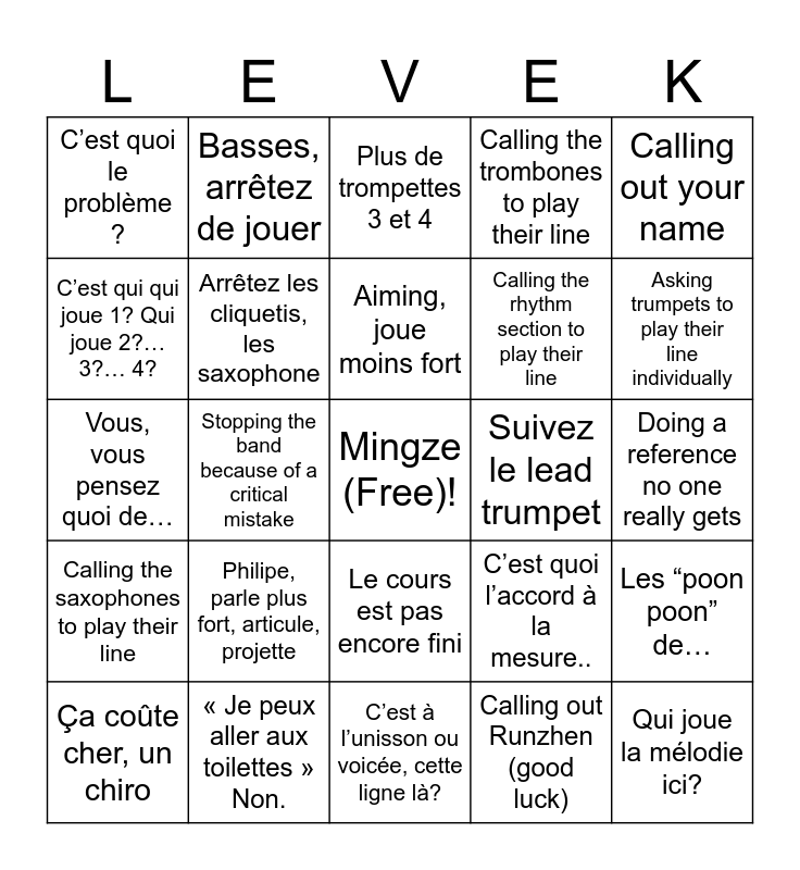 This bingo card has a free space and 33 words: Giving the fingering for saxophones, Giving the fingering for trumpets, Stopping the band because of a critical mistake, Kevin/Milan, regardez moi, Calling the saxophones to play their line, Arrêtez les cliquetis, les saxophone, Calling out your name, Ça coûte cher, un chiro, Basses, arrêtez de jouer, Guitares, arrêtez de jouer, Aiming, joue moins fort, Plus de trompettes 3 et 4, J’entends pas les voix internes, Pitch!, Suivez le lead trumpet, Asking trumpets to play their line individually, « Je peux aller aux toilettes » Non., Vous, vous pensez quoi de…, Philipe, parle plus fort, articule, projette, C’est quoi l’accord à la mesure.., Le cours est pas encore fini, J’ai pas dit « Jean dit », C’est quoi le problème ?, Doing a reference no one really gets, C’est à l’unisson ou voicée, cette ligne là?, Qui joue la mélodie ici?, Calling the trombones to play their line, Calling the rhythm section to play their line, C’est qui qui joue 1? Qui joue 2?… 3?… 4?, Les “poon poon” de…, Asking for people to sing the articulation/line, Calling out Runzhen (good luck) and Putting his finger on his ear for the saxophone intonation.