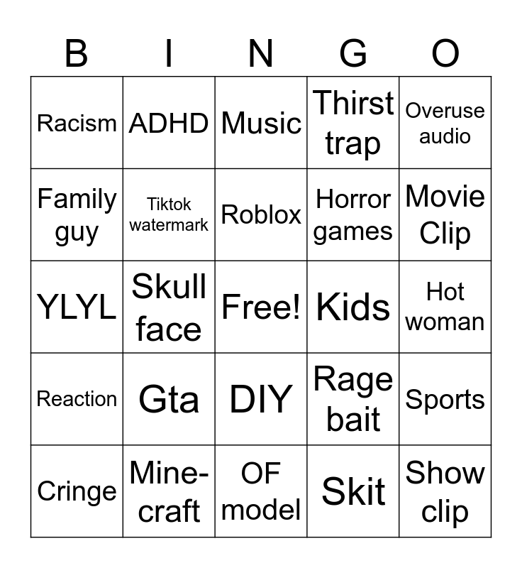 This bingo card has a free space and 24 words: Gta, Mine-craft, Roblox, Cringe, Overuse audio, Racism, Family guy, ADHD, Kids, DIY, Horror games, YLYL, Rage bait, Sports, Tiktok watermark, Skit, Hot woman, Music, Movie Clip, Skull face, Show clip, Reaction, Thirst trap and OF model.