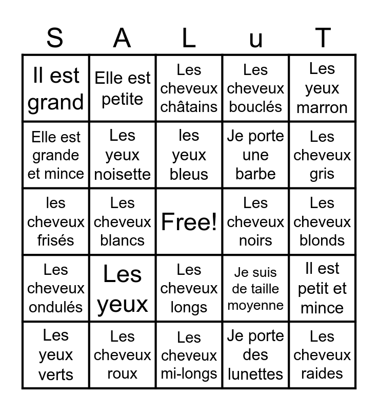 This bingo card has a free space and 24 words: Les yeux, Les cheveux roux, les yeux bleus, Les yeux verts, Les yeux marron, Il est grand, Elle est grande et mince, Elle est petite, Les cheveux noirs, Les cheveux longs, Je porte une barbe, les cheveux frisés, Je suis de taille moyenne, Il est petit et mince, Les yeux noisette, Je porte des lunettes, Les cheveux blonds, Les cheveux châtains, Les cheveux gris, Les cheveux blancs, Les cheveux raides, Les cheveux ondulés, Les cheveux bouclés and Les cheveux mi-longs.