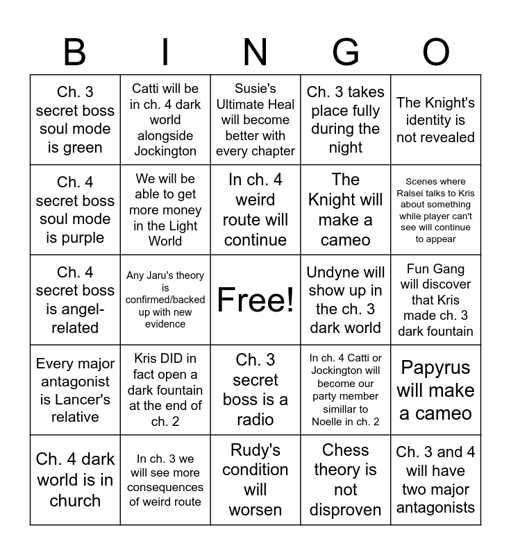This bingo card has a free space and 24 words: Kris DID in fact open a dark fountain at the end of ch. 2, In ch. 3 we will see more consequences of weird route, In ch. 4 weird route will continue, Ch. 4 dark world is in church, The Knight's identity is not revealed, Ch. 3 secret boss soul mode is green, Ch. 4 secret boss soul mode is purple, Catti will be in ch. 4 dark world alongside Jockington, Undyne will show up in the ch. 3 dark world, Ch. 3 secret boss is a radio, The Knight will make a cameo, Ch. 4 secret boss is angel-related, In ch. 4 Catti or Jockington will become our party member simillar to Noelle in ch. 2, Papyrus will make a cameo, We will be able to get more money in the Light World, Chess theory is not disproven, Fun Gang will discover that Kris made ch. 3 dark fountain, Susie's Ultimate Heal will become better with every chapter, Scenes where Ralsei talks to Kris about something while player can't see will continue to appear, Any Jaru's theory is confirmed/backed up with new evidence, Ch. 3 and 4 will have two major antagonists, Every major antagonist is Lancer's relative, Ch. 3 takes place fully during the night and Rudy's condition will worsen.