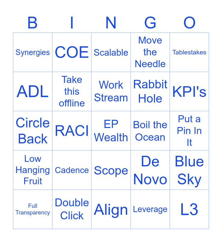 This bingo card has a free space and 24 words: Cadence, Double Click, Work Stream, Full Transparency, Tablestakes, Synergies, ADL, COE, Boil the Ocean, Scope, Rabbit Hole, Circle Back, De Novo, Blue Sky, Take this offline, Leverage, Put a Pin In It, Scalable, KPI's, RACI, L3, Low Hanging Fruit, Move the Needle and Align.