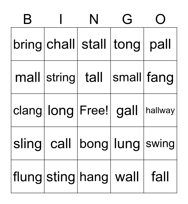 This bingo card has a free space and 24 words: call, sting, tall, flung, pall, bring, mall, chall, gall, bong, small, clang, lung, swing, string, wall, hallway, stall, fang, long, fall, sling, tong and hang.