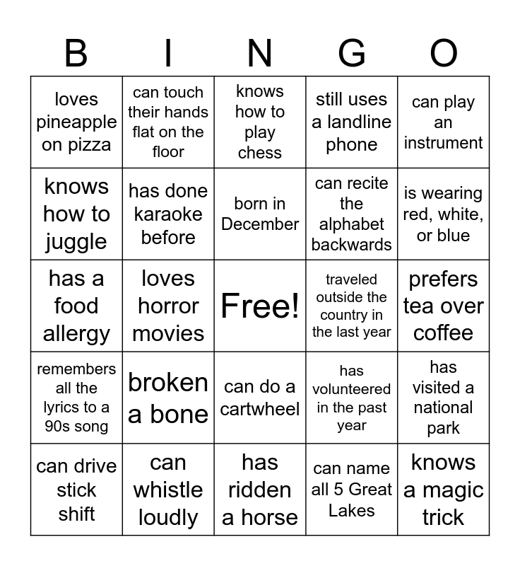 This bingo card has a free space and 24 words: broken a bone, can whistle loudly, born in December, can drive stick shift, can play an instrument, loves pineapple on pizza, knows how to juggle, can touch their hands flat on the floor, traveled outside the country in the last year, can do a cartwheel, can recite the alphabet backwards, has a food allergy, has volunteered in the past year, has visited a national park, has done karaoke before, can name all 5 Great Lakes, prefers tea over coffee, knows how to play chess, is wearing red, white, or blue, loves horror movies, knows a magic trick, remembers all the lyrics to a 90s song, still uses a landline phone and has ridden a horse.