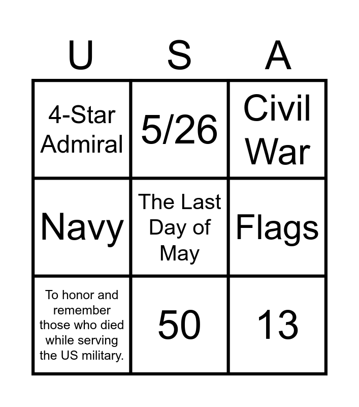 This bingo card has 11 words: 13, 50, The Last Day of May, To honor and remember those who died while serving the US military., 5/26, Civil War, Flags, The Great War, Navy, 4-Star Admiral and The Medal of Honor.