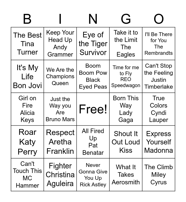This bingo card has a free space and 24 words: Respect Aretha Franklin, Fighter Christina Aguleira, Boom Boom Pow Black Eyed Peas, Can't Touch This MC Hammer, I'll Be There for You The Rembrandts, The Best Tina Turner, It's My Life Bon Jovi, Keep Your Head Up Andy Grammer, Born This Way Lady Gaga, All Fired Up Pat Benatar, Time for me to Fly REO Speedwagon, Girl on Fire Alicia Keys, Shout It Out Loud Kiss, Express Yourself Madonna, We Are the Champions Queen, What It Takes Aerosmith, True Colors Cyndi Lauper, Eye of the Tiger Survivor, Can't Stop the Feeling Justin Timberlake, Just the Way you Are Bruno Mars, The Climb Miley Cyrus, Roar Katy Perry, Take it to the Limit The Eagles and Never Gonna Give You Up Rick Astley.