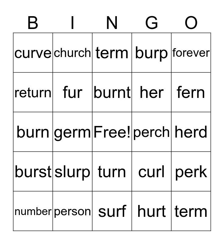This bingo card has a free space and 24 words: slurp, person, burnt, number, forever, curve, return, church, perch, turn, her, burn, curl, perk, fur, hurt, herd, term, fern, germ, term, burst, burp and surf.