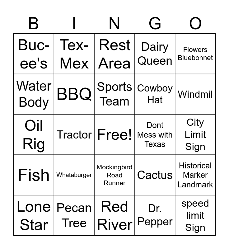 This bingo card has a free space and 24 words: Whataburger, Pecan Tree, Sports Team, Lone Star, Flowers Bluebonnet, Buc-ee's, Water Body, Tex- Mex, Dont Mess with Texas, Mockingbird Road Runner, Cowboy Hat, Oil Rig, Cactus, Historical Marker Landmark, BBQ, Dr. Pepper, City Limit Sign, Rest Area, Windmil, Tractor, speed limit Sign, Fish, Dairy Queen and Red River.