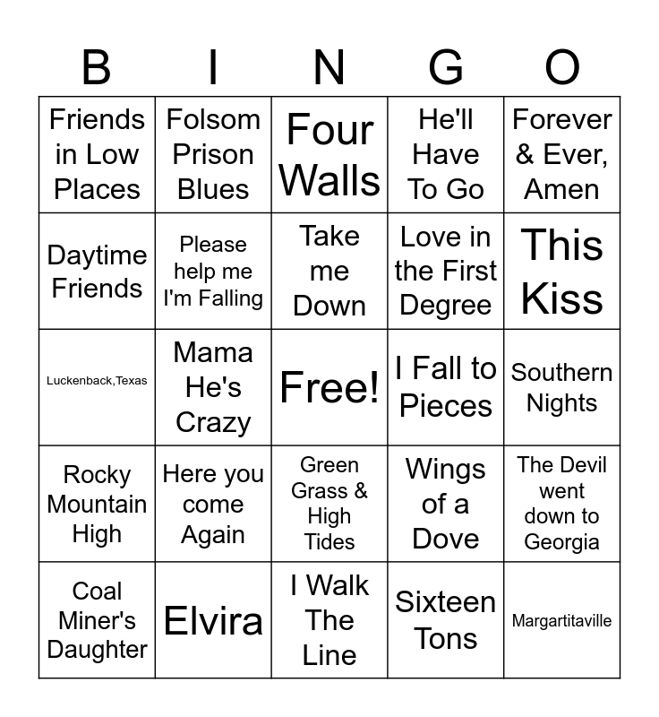 This bingo card has a free space and 24 words: Here you come Again, Elvira, Take me Down, Coal Miner's Daughter, Forever & Ever, Amen, Friends in Low Places, Daytime Friends, Folsom Prison Blues, I Fall to Pieces, Green Grass & High Tides, Love in the First Degree, Luckenback,Texas, Wings of a Dove, The Devil went down to Georgia, Please help me I'm Falling, Sixteen Tons, Southern Nights, Four Walls, This Kiss, Mama He's Crazy, Margartitaville, Rocky Mountain High, He'll Have To Go and I Walk The Line.