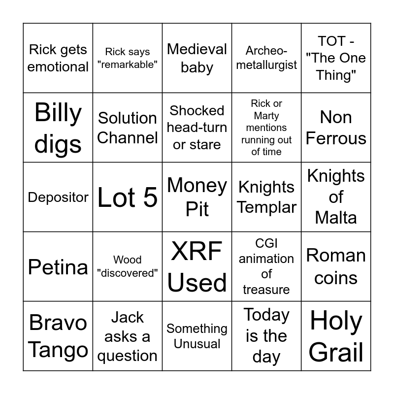This bingo card has a free space and 24 words: Wood "discovered", Jack asks a question, Shocked head-turn or stare, Bravo Tango, TOT - "The One Thing", Rick gets emotional, Billy digs, Rick says "remarkable", Knights Templar, XRF Used, Rick or Marty mentions running out of time, Depositor, CGI animation of treasure, Roman coins, Solution Channel, Today is the day, Knights of Malta, Medieval baby, Non Ferrous, Lot 5, Holy Grail, Petina, Archeo- metallurgist and Something Unusual.