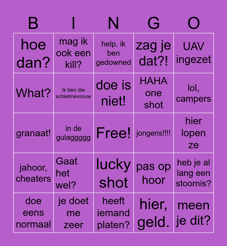 This bingo card has a free space and 24 words: Gaat het wel?, je doet me zeer, doe is niet!, doe eens normaal, UAV ingezet, hoe dan?, What?, mag ik ook een kill?, jongens!!!!, lucky shot, HAHA one shot, granaat!, pas op hoor, heb je al lang een stoornis?, ik ben die schietmevrouw, hier, geld., hier lopen ze, help, ik ben gedowned, lol, campers, in de gulaggggg, meen je dit?, jahoor, cheaters, zag je dat?! and heeft iemand platen?.