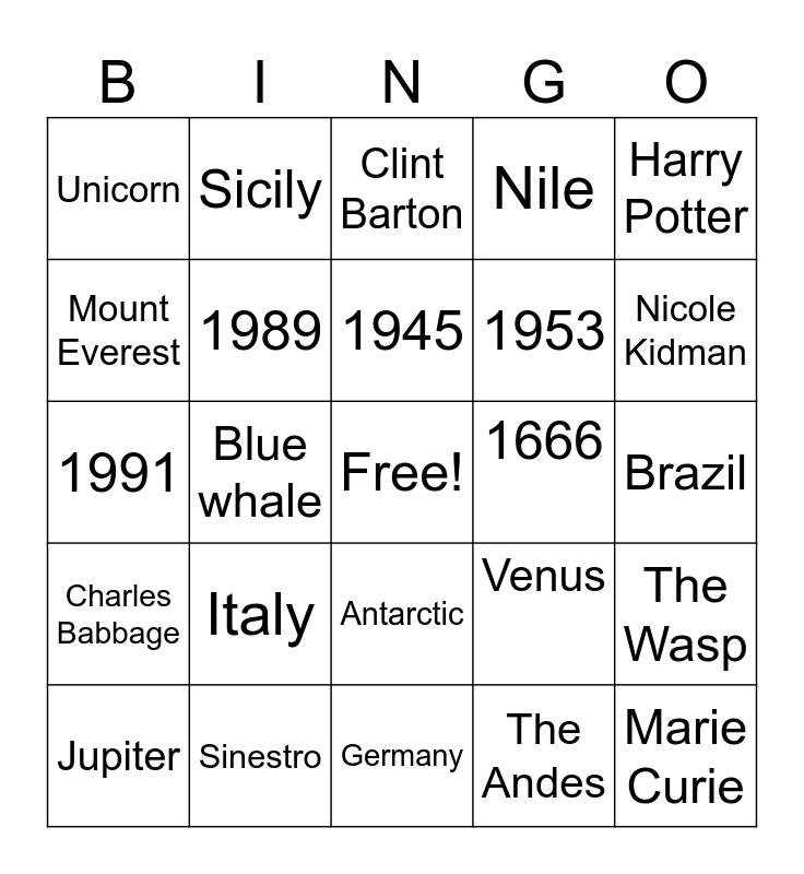 This bingo card has a free space and 35 words: 1912, Canberra, Mars, 1989, Antarctic, Nile, Mount Everest, Pacific, 1945, Neil Armstrong, 1991, Harry Potter, Star Trek, Hippopotamus, Unicorn, 1666, The Andes, Blue whale, Charles Babbage, Marie Curie, Venus, Jupiter, The Wasp, Sinestro, Clint Barton, Nicole Kidman, Emily Blunt, Horse, 1953, Brazil, China, Germany, Italy, Sicily and Colorado.