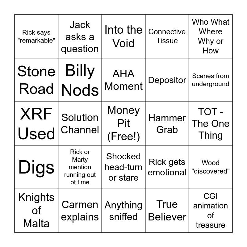 This bingo card has a free space and 24 words: Rick or Marty mention running out of time, Carmen explains, AHA Moment, Knights of Malta, Who What Where Why or How, Rick says "remarkable", Stone Road, Jack asks a question, Hammer Grab, Shocked head-turn or stare, Depositor, XRF Used, Rick gets emotional, Wood "discovered", Billy Nods, True Believer, TOT - The One Thing, Into the Void, Scenes from underground, Solution Channel, CGI animation of treasure, Digs, Connective Tissue and Anything sniffed.