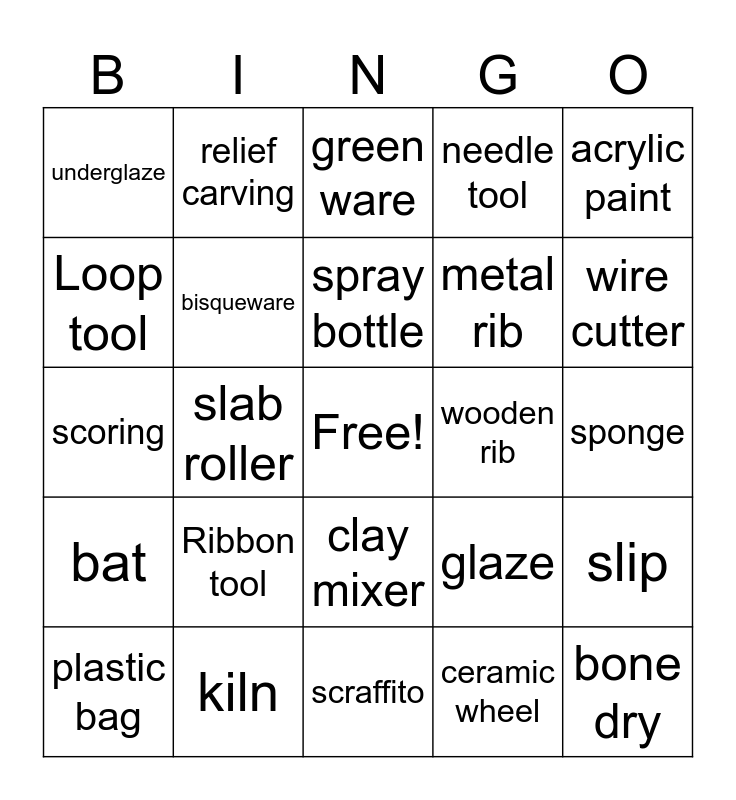 This bingo card has a free space and 24 words: Ribbon tool, kiln, spray bottle, plastic bag, acrylic paint, underglaze, Loop tool, relief carving, wooden rib, clay mixer, metal rib, scoring, glaze, slip, bisqueware, ceramic wheel, sponge, green ware, wire cutter, slab roller, bone dry, bat, needle tool and scraffito.