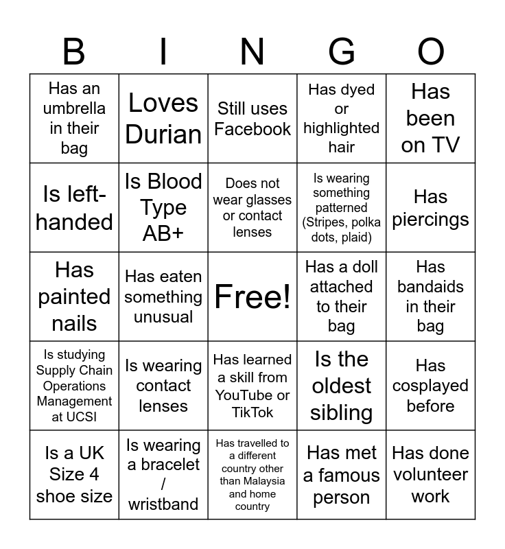 This bingo card has a free space and 34 words: Uses more than one phone, Can speak 3 languages, Has won a competition, Has broken a bone, Has bandaids in their bag, Is left-handed, Is Blood Type AB+, Has travelled to a different country other than Malaysia and home country, Is wearing something patterned (Stripes, polka dots, plaid), Has done volunteer work, Has painted nails, Loves Durian, Has met a famous person, Has 5 siblings (not including themselves), Is studying Supply Chain Operations Management at UCSI, Has eaten something unusual, Has learned a skill from YouTube or TikTok, Has a doll attached to their bag, Has cosplayed before, Is a UK Size 4 shoe size, Is wearing a bracelet / wristband, Can whistle, Has dyed or highlighted hair, Has piercings, Can curl their tongue in a "U" shape, Is wearing contact lenses, Still uses Facebook, Has a pet, Has been on TV, Has an umbrella in their bag, Is an only child, Does not wear glasses or contact lenses, Is the oldest sibling and Is the youngest sibling.