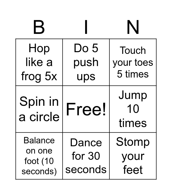 This bingo card has a free space and 8 words: Jump 10 times, Touch your toes 5 times, Do 5 push ups, Balance on one foot (10 seconds), Hop like a frog 5x, Stomp your feet, Spin in a circle and Dance for 30 seconds.